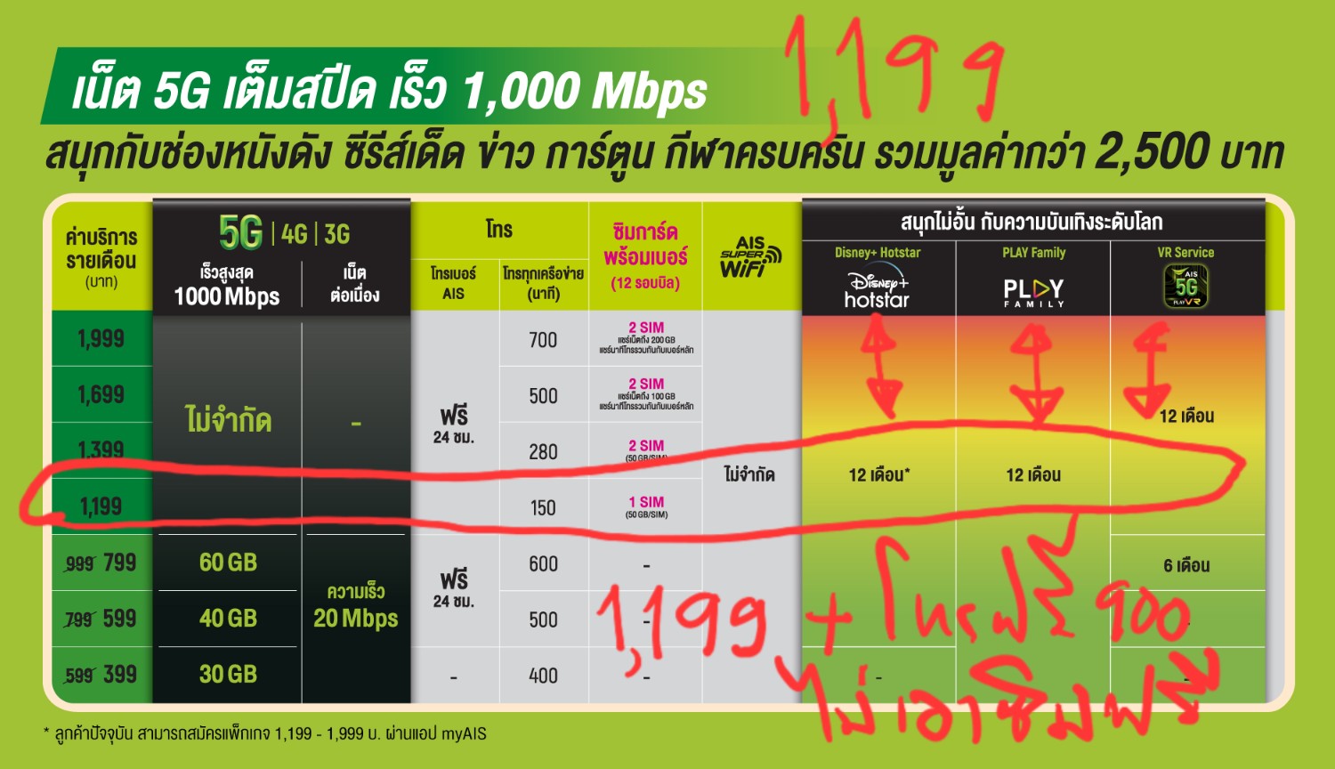 1. แพ็กเกจรายเดือน 1,199