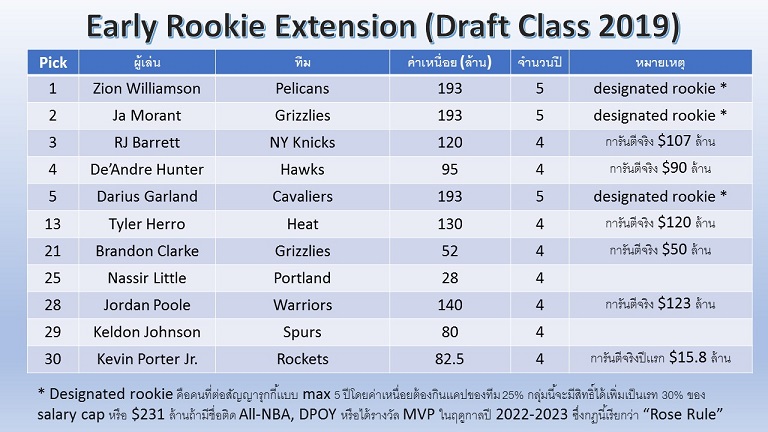 ผู้เล่นจาก draft รอบเเรกปี 2019 มีสิทธิ์ต่อสัญญารุกกี้ล่วงหน้าก่อนหมดอายุ 1 ปีซึ่งวันนี้เป็นวันสุดท้ายในการเจรจาโดยมีทั้งหมด 11 คนที่ได้สัญญาใหม่ทันเวลาตามตารางข้างล่าง ส่วนใหญ่จะต่อเเบบ 4 ปีเพราะมีความยืดหยุ่นในการเจรจาตัวเลขค่าเหนื่อย