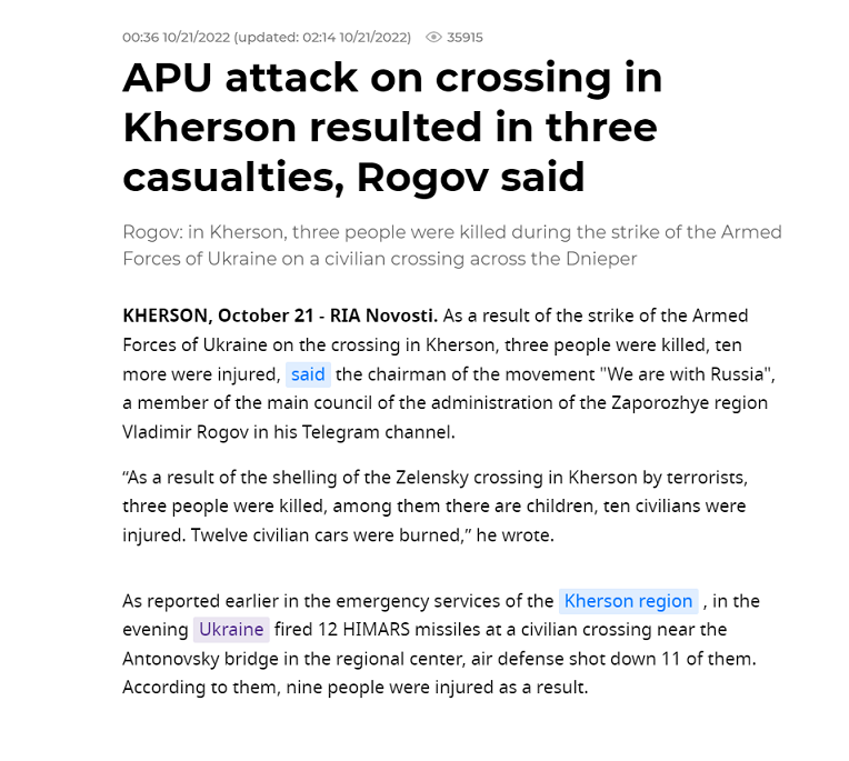 มีการเปลี่ยนแปลงพื้นที่ สังเกต ********** - นักวิจารณ์ชาวรัสเซียวิพากษ์วิจารณ์คำแถลงของกระทรวงกลาโหมรัสเซียเกี่ยวกับการถอนตัวของรัสเซียไปยังฝั่งซ้าย - กองกำลังยูเครนยังคงมุ่งเป้าไ