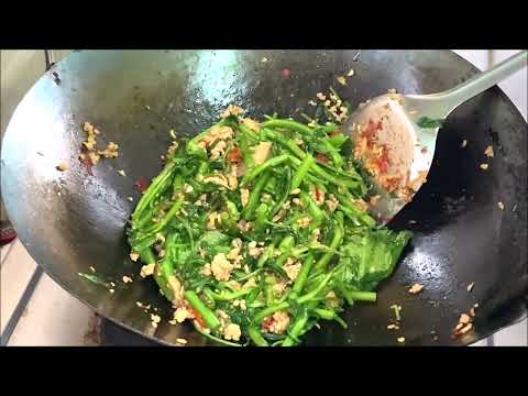 6. ใส่ผักบุ้งลงไปผัดจนสลด ปิดเตา