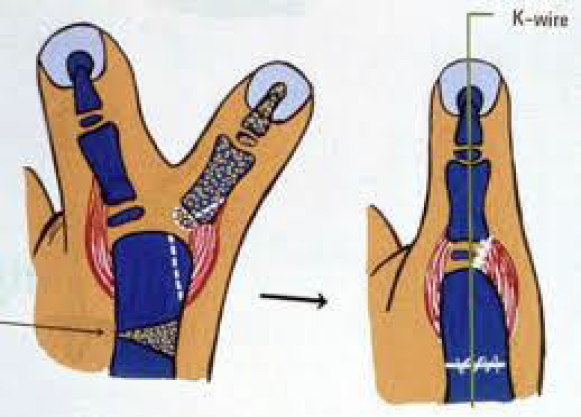 รูปที่ 4: การผ่าตัดประกอบด้วย การตัดนิ้วส่วนเกินออกและตัดหัวกระดูกที่รองรับนิ้วส่วนเกินที่ใหญ่กว่าปกติ และกล้ามเนื้อมายังฐานนิ้วที่ปกติ ตัดแต่งมุมกระดูกโคนนิ้วเพื่อให้นิ้วตรงขึ้นไม่เอียงเข้าหานิ้วชี้