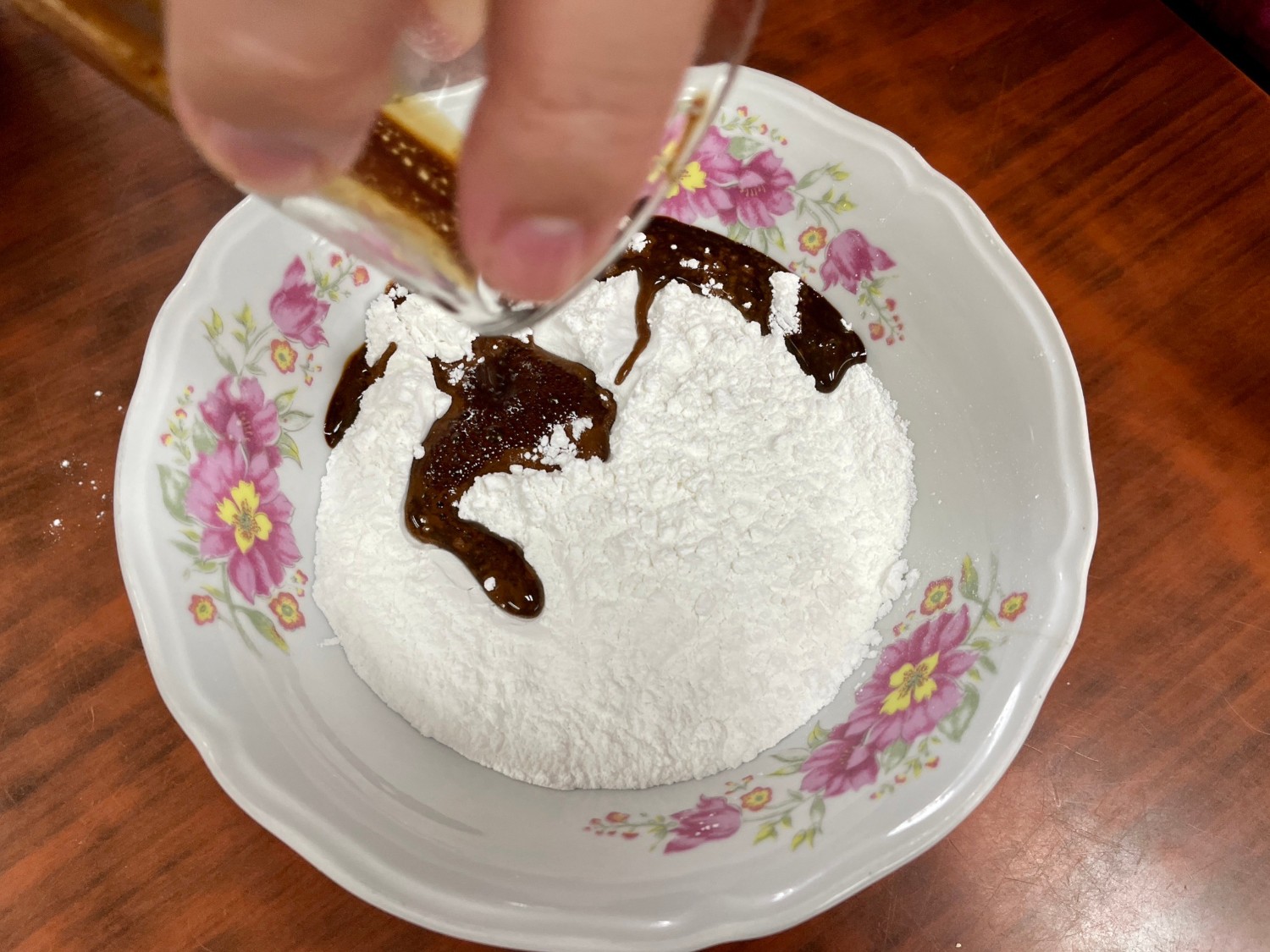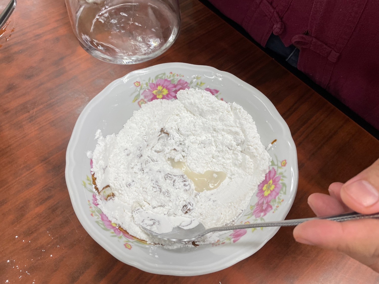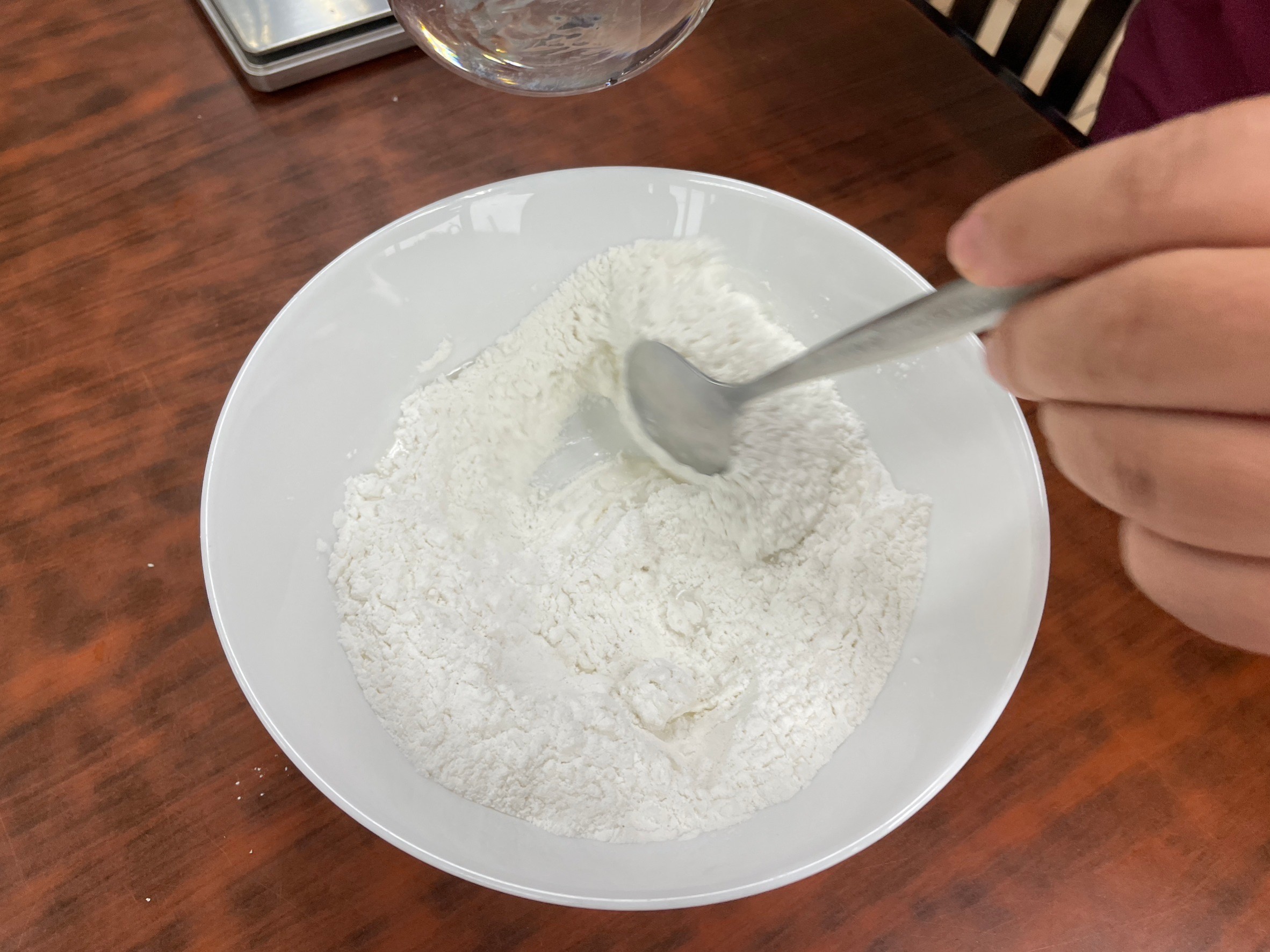 เทใส่แป้ง ค่อย ๆ เติมน้ำเปล่า นวดให้พอปั้นได้