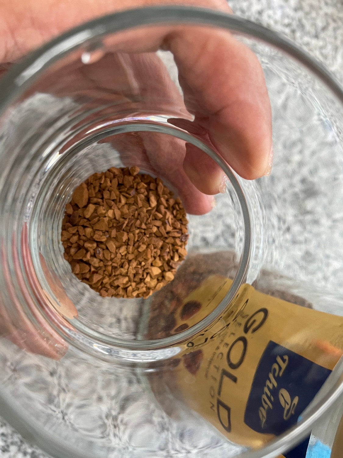 ใช้กาแฟอะไรก็ได้ที่บ้านเรามีค่ะ เติมน้ำร้อนแค่พอกาแฟละลาย