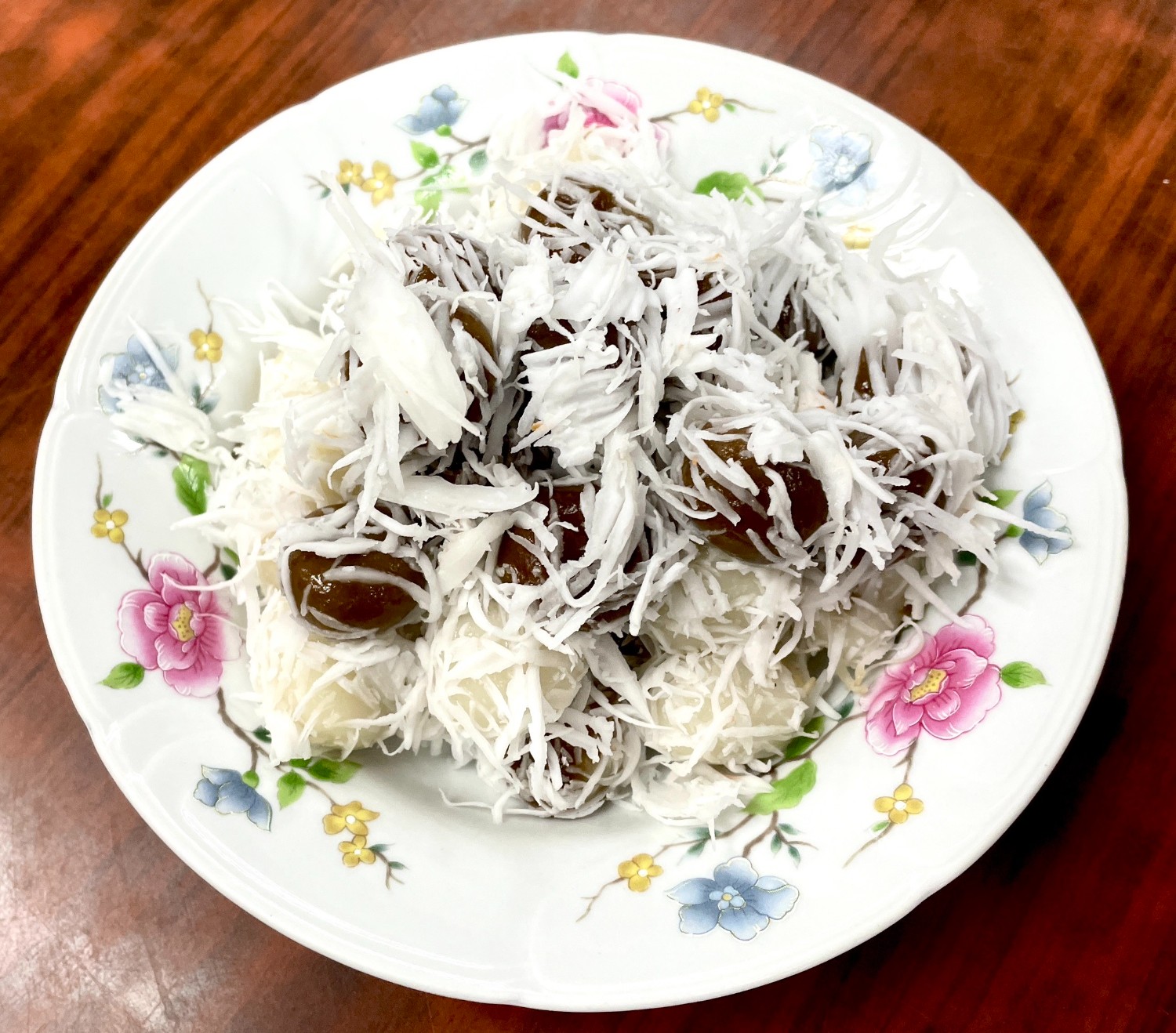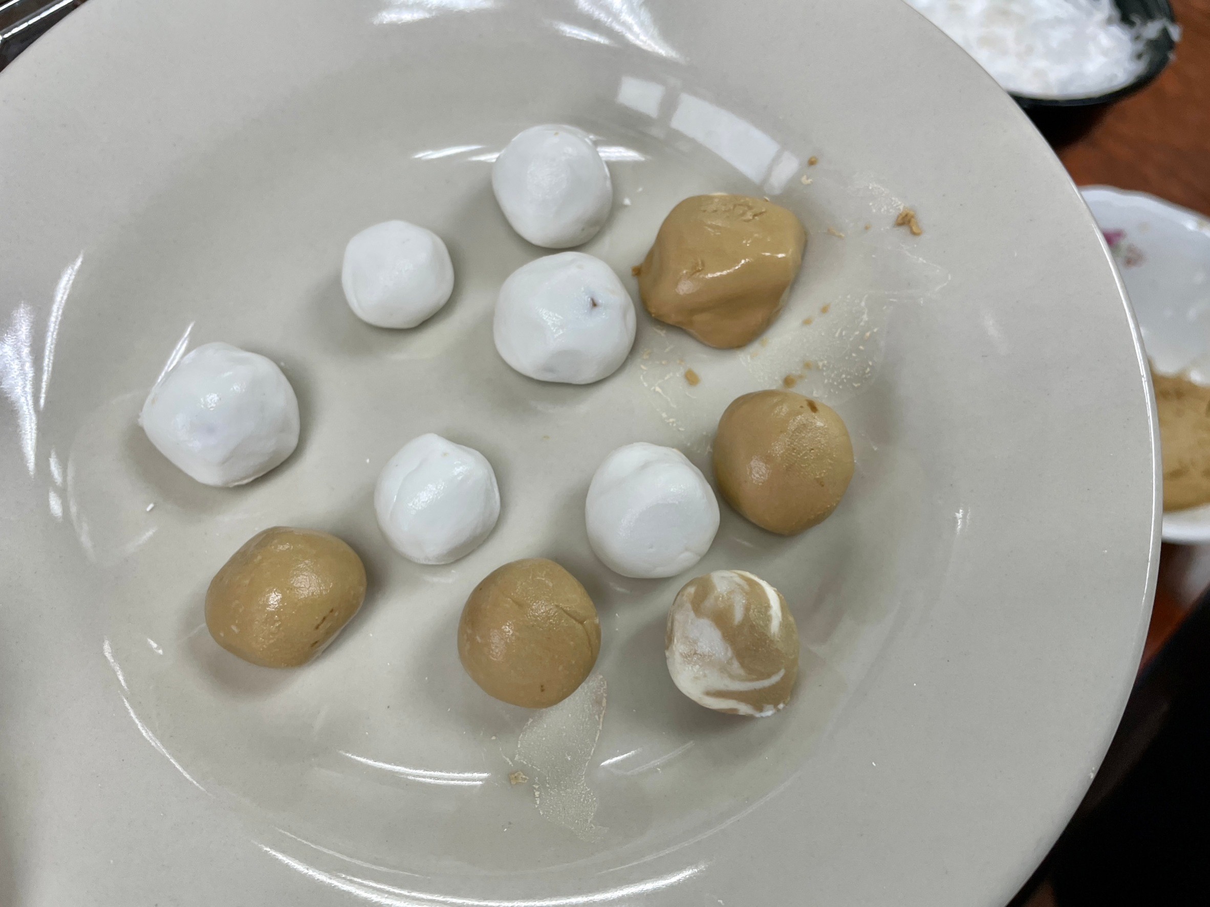 มาถึงขั้นการปั้นแล้ว ปั้นแค่พอดีคำ แผ่แป้งเป็นแผ่นกลม ๆ แล้ววางน้ำตาลที่เราหั่นแล้วจากนั้นก็ปั้นให้เป็นก้อน