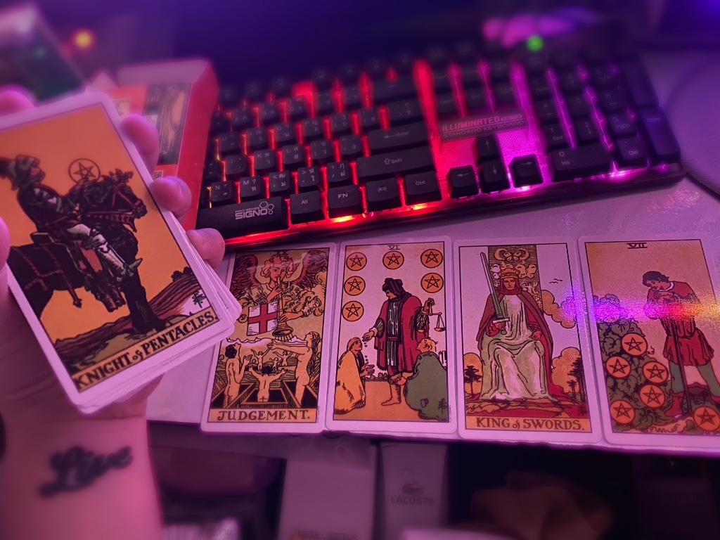 ถามไพ่ว่า วันนี้คนคุยฝรั่งเศส รู้สึกกับเรายังไงบ้างคะ ได้ไพ่ เจ็ดเหรียญ+judement+page of swords