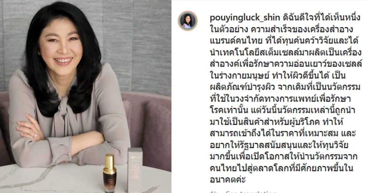 ‘ยิ่งลักษณ์’ ชื่นชมเครื่องสำอางแบรนด์คนไทย ได้ทุนค้นคว้าวิจัย นำเทคโนโลยีสเต็มเซลล์มาผลิต