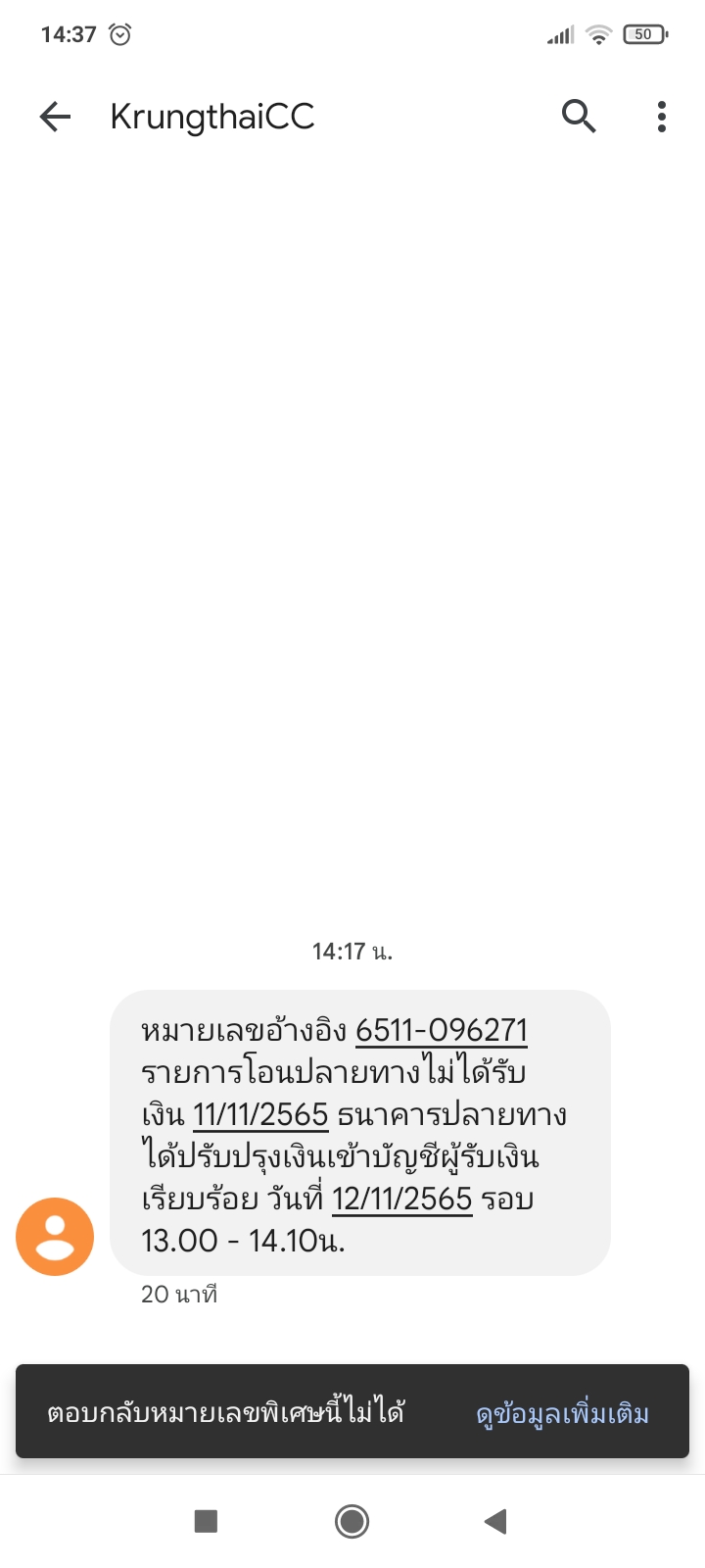 โอนเงินจากกรุงไทยไปไทยพาณิชย์ไม่เข้า แล้ว พนง.โยนกันไปกันมาอีก