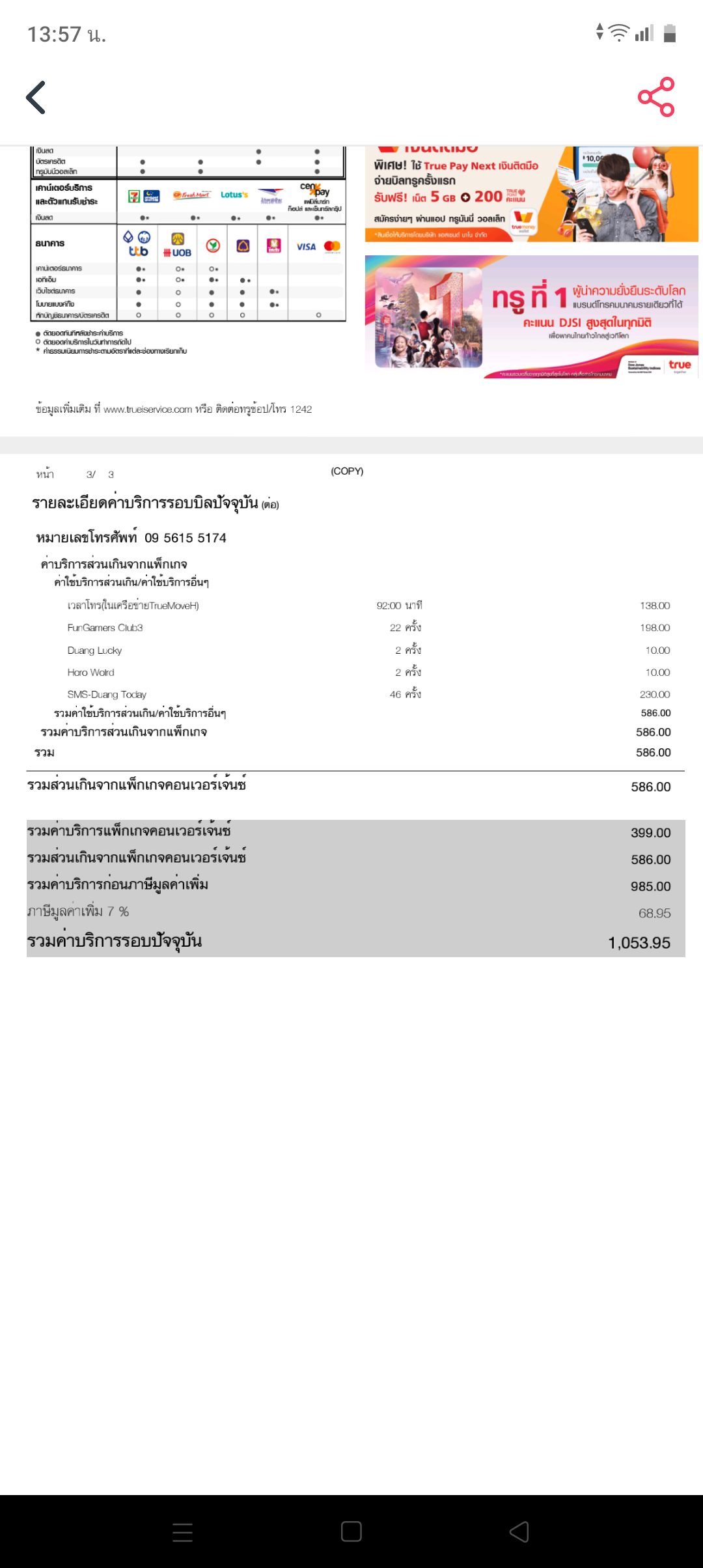 สวัสดีครับทุกท่านวันนี้ผมมาระบายทรูหน่อย ผมใช้เน็ตบ้านทรูอยู่ ส่วนซิมเบอร์ก็เป็นแพ๊คเกจทีีแถมมากับ แพ๊คเกจเน็ตบ้านเป็นซิมเน็ตไม่อั้ม จ่ายรวมทุกอย่างตกเดือนละ ห้าร้อย กว่าบาท พอมาเดือนนี้ บิลแจ้งมาพันห