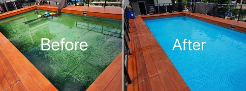 ซึ่งถ้าในสระของเราไม่มีระบบกรองหรือไม่มีคลอรีนก็จะทำให้เกิดตะไคร่ หลังจากนั้นประมาณ 5-10 วัน น้ำในสระก็จะเริ่มเขียวทั้งสระเลยค่ะ