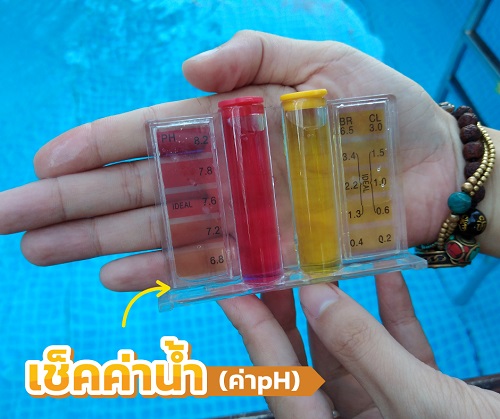 ขั้นตอนแรก ให้วัดค่าpH ของน้ำ โดยจะใช้ชุดวัดค่า pH (แบบหยด) ตักน้ำในสระใส่หลอดทดสอบ