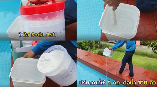 ถ้าค่า pH ต่ำ (แสดงว่าน้ำในสระมีความเป็นกรด) ให้ใส่ Soda Ash เพื่อเพิ่มค่า pH ก่อน