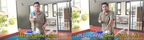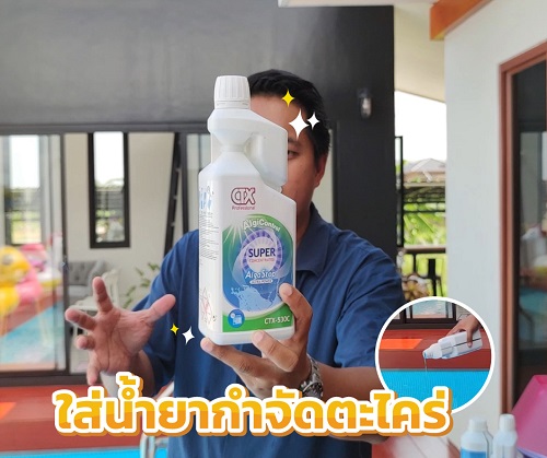 ขั้นตอนต่อไปให้ใส่ตัวเสริมน้ำยาป้องกันและกำจัดตะไคร่ ปริมาณที่ใช้ครั้งแรก 200 ml./น้ำ 50 คิว