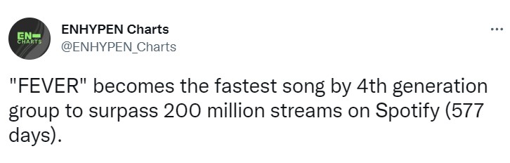 ขณะนี้ Fever ของ Enhypen เป็นเพลงของวง Gen4th ที่มียอด stream บน Spotify แตะ 200 ล้านไวที่สุด