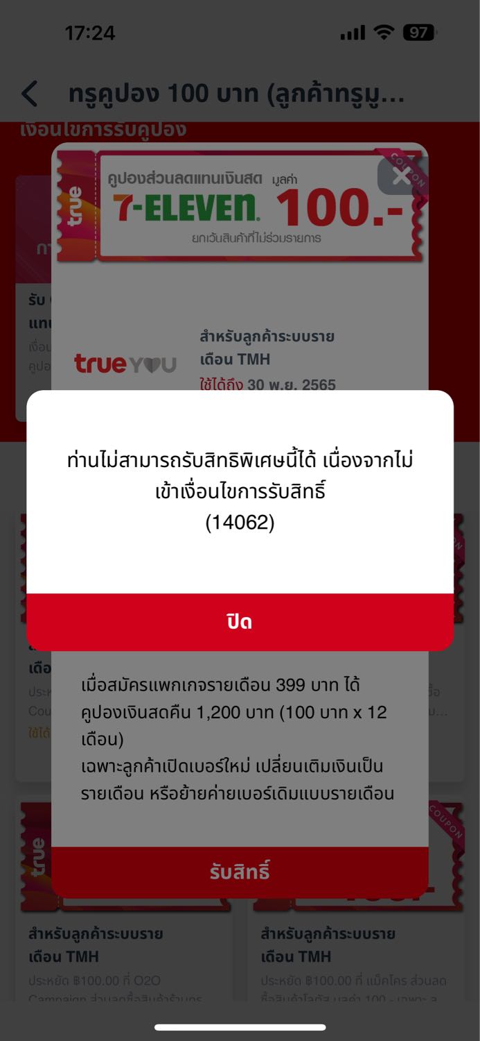 คูปองทรู ที่ย้ายค้าย *888# เมื่อเราจ่ายบิลเต็มยอดแล้ว แต่ทำมัยยังกดรับสิทธิ์ไม่ได้