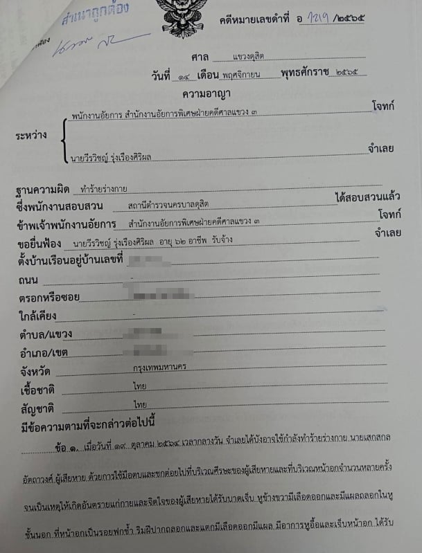 19 พ.ย.2565 - ผู้สื่อข่าวรายงานว่าเมื่อวันที่ 14 พ.ย.ที่ผ่านมาอัยการ เป็นโจทย์ยื่นฟ้องนายนายวีรวิชญ์ รุ่งเรืองศิริผล เป็นจำเลยคดีหมายเลขดำที่ อ.1219/2565 ความผิดฐาน ทำร้ายผู้อื่น จนเป็นเหตุให้เกิดอันตรายแก่กายหรือจิตใจของผู้อื่น ตามประมวลกฎหมายอาญามาตรา 295