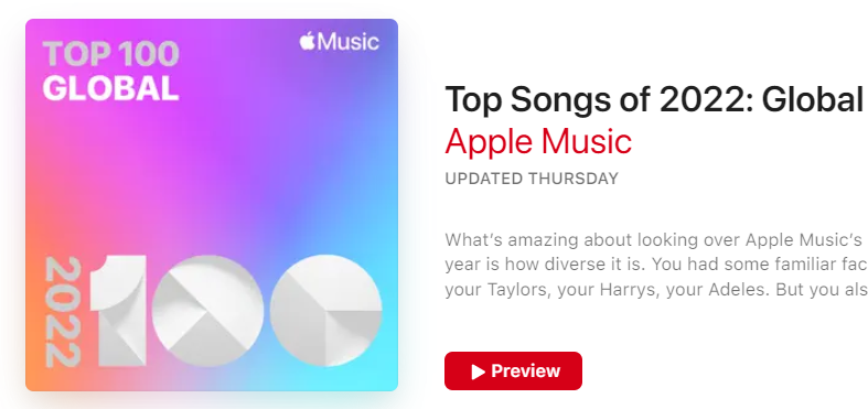 เพลง Dynamite และ Butter ถูกรวมอยู่ในรายชื่อเพลงที่มียอดสตรีมสูงสุดจากทั่วโลกบน Apple Music global ในปี 2022