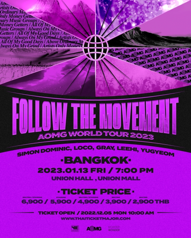 “[ฟอลโลว์ เดอะ มูฟเมนต์] เอโอเอ็มจี เวิลด์ ทัวร์ 2023 อิน แบงคอก” ([FOLLOW THE MOVEMENT] AOMG WORLD TOUR 2023 IN BANGKOK) วันศุกร์ที่ 13 มกราคม 2566 เวลา 19:00 น. ณ ยูเนี่ยน ฮอลล์ ชั้น 6 ศูนย์การค้ายูเนี่ยน มอลล์