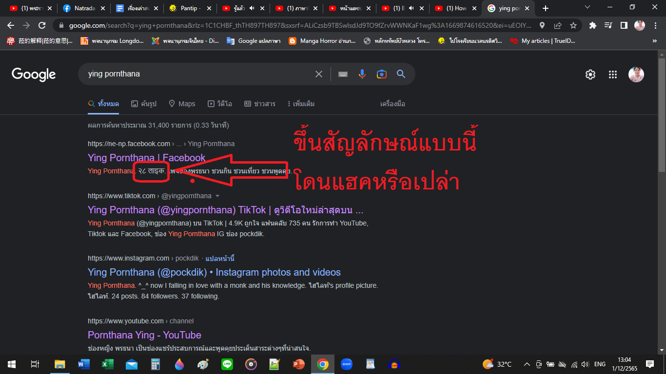 หญิงเสิร์ซชื่อตัวเองในกูเกิ้ลแล้ว มันขึ้นแบบนี้ตามในรูปเลย มันคือภาษาอะไร แล้วแปลว่าอะไรคะ ทำไมกูเกิ้ลถึงขึ้นแบบนี้กับช่องของหญิง ? ช่องหญิงโดนแฮคหรือเปล่าคะ?