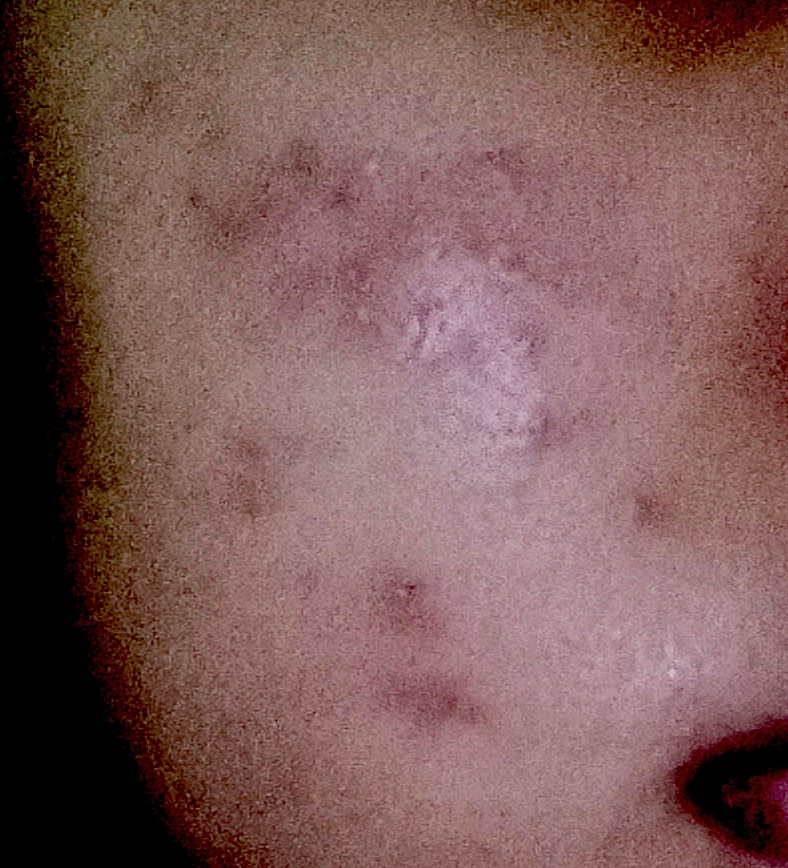 ตอนแรกมันจะขึ้นมาเหมือนสิวอุดตันแป็นปื้นค่ะ แล้วมันก็รามทั่วหน้าข้างซ้าย ทั้งหน้ามีสิวแค่ตรงนี้ค่ะ