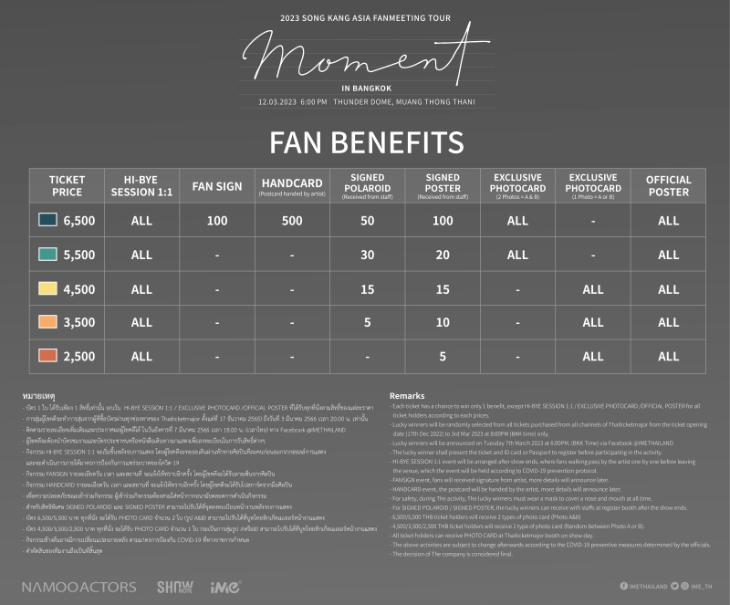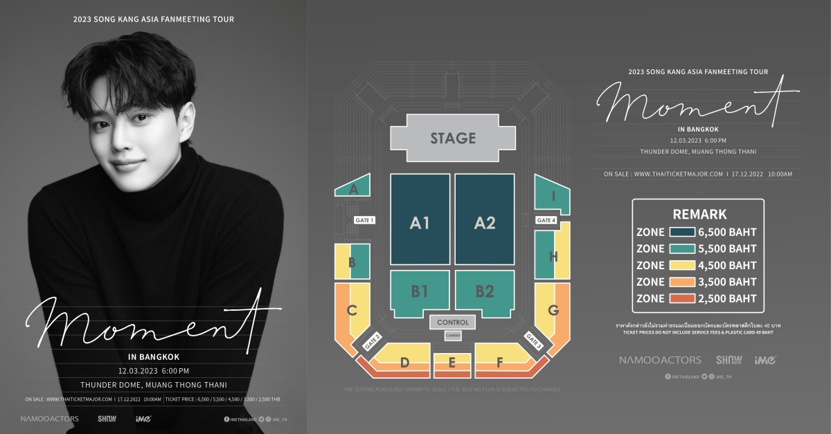 2023 SONG KANG ASIA FANMEETING TOUR 'MOMENT' IN BANGKOK ในวันอาทิตย์ที่ 12 มีนาคม 2566 เวลา 18.00 น. ณ ธันเดอร์โดม เมืองทองธานี งานนี้ซงพยอน (ชื่อแฟนคลับ) และแฟนๆ ซีรีส์ของหนุ่มซงคังไม่ควรพลาด บุ๊คคิว พร้อมเตรียมตัวให้พร้อมกับสงครามแย่งชิงบัตรที่จะเปิดขายในวันเสาร์ที่ 17 ธันวาคมนี้!!