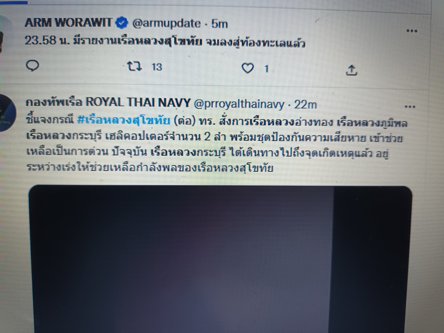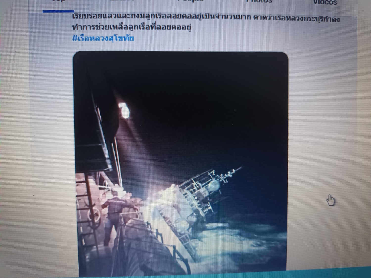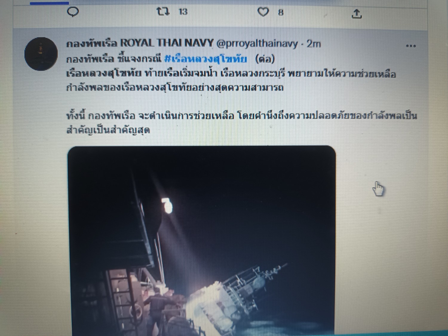 เรือหลวงสุโขทัย อัปปางแล้ว ทร.จะดำเนินการช่วยเหลือ โดยคำนึงถึงความปลอดภัยของกำลังพล เป็นหลักสำคัญที่สุด