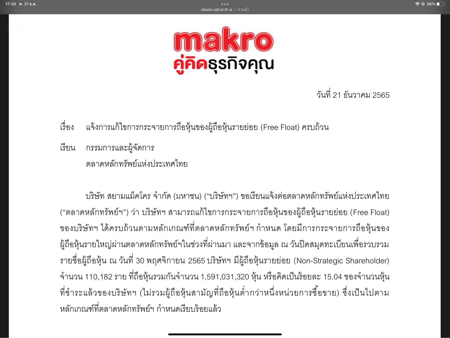 สำนักข่าวถุงนิวส์ก่อมเกมส์ผู้มาก่อนกาลใครก็ตามห้ามพูดก่อนกรู: Makro แจ้งการแก้ไขการกระจายการถือห้นุของผู้ถือหุ้นรายย่อย