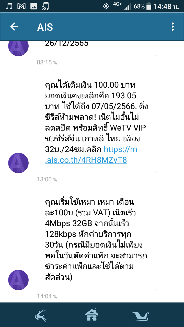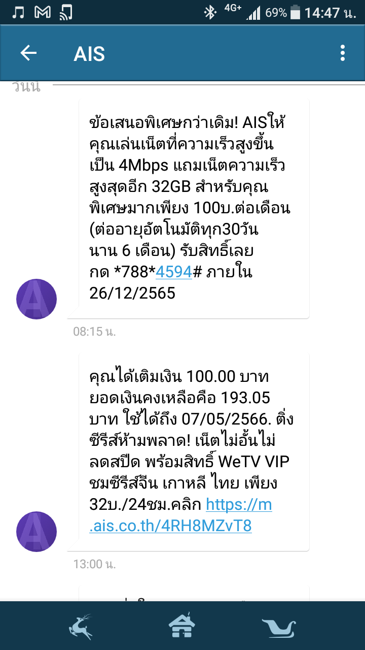 มีsmsจากaisเสนอแพ็คเกจเน็ตความเร็ว4เม็กพร้อมแถมเน็ตความเร็วสูงสุดจำนวน32กิ๊กมาให้
