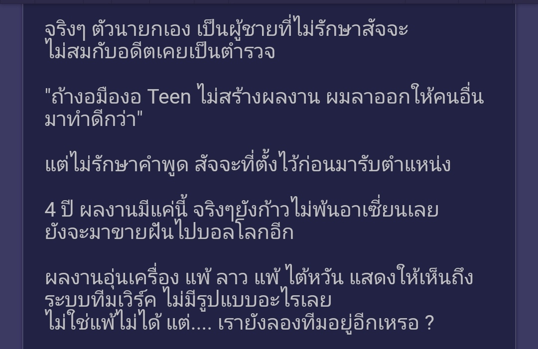 "เป็นนายกสมาคมฯแล้ว ทำไม่ได้ อย่าเป็น ให้คนอื่นเขาเป็น " "ถ้าให้ผมงอมืองอตีนกับสถานการณ์เช่นนี้ แล้วปล่อยให้ทีมชาติไทยเป็นอย่างนี้อีก 3 ปี ผมลาออกดีกว่า&qu