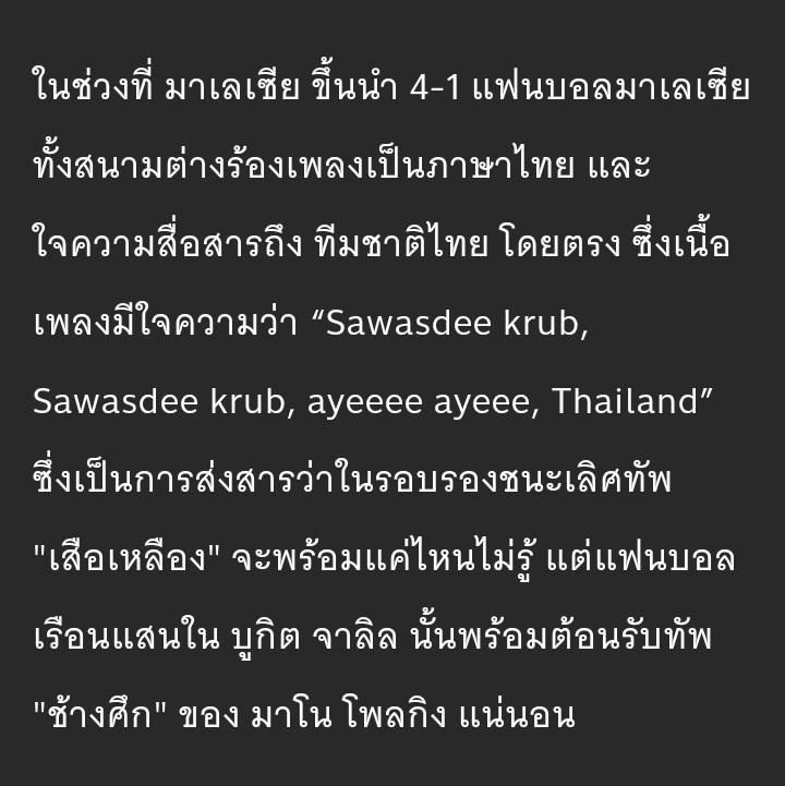 "Sawadee Krub Thailand" แฟนบอลมาเลร่วมร้องส่งสารถึงไทยระหว่างเกมส์เจอสิงคโปร์เมื่อคืน