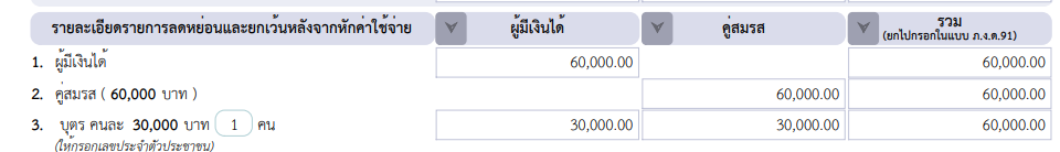 คือผมสมรสกับแฟน และ อยู่ด้วยกันตลอดปีภาษี และมีบุตร 1 คน คือที่ผมอ่านเจอคือ สามารถลดหย่อยภาษีบุตรได้ คนละ 30,000 บาท แต่ทำไม่ในระบบของสรรพากรตอนที่ยืนแบบ ถึงรวมคู่สมรสแล้ว ลดหย่อนได้ถึง 60,000 บาทหรอครับ เพราะลูกผมคนเดียวควรจะลดได้แค่ 30,000 บาท หรือป่าวครับ หรือผมเข้าใจอะไรผิดไป พอดีพึ่งสังเกตุเห็น ขอบคุณนะครับ