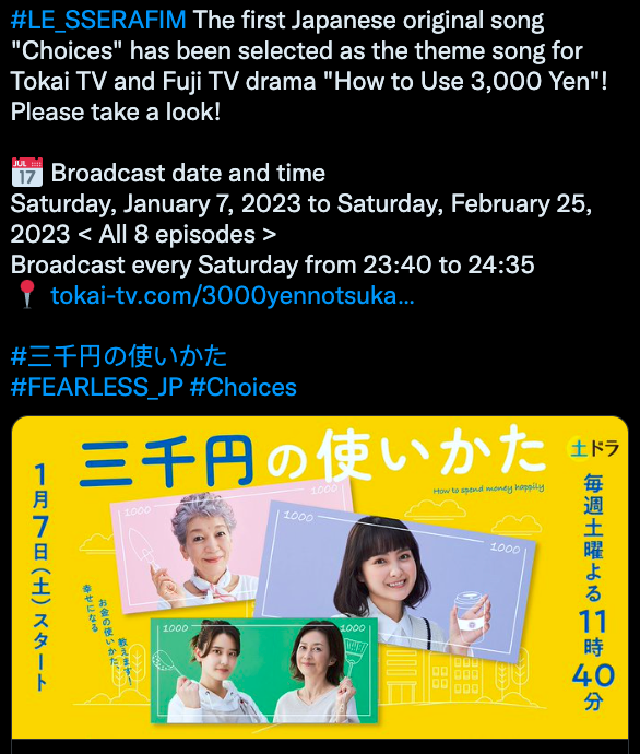 [LE SSERAFIM] Choices เพลง Original Japanese Track เพลงแรกของวงถูกเลือกเป็นเพลง OST ของซีรีส์ญี่ปุ่น 7 มค. นี้