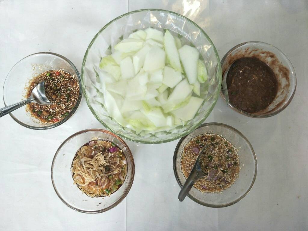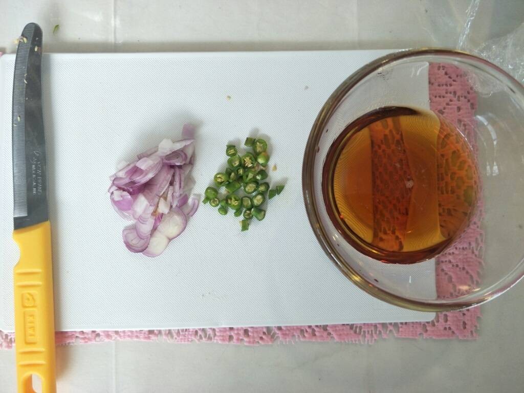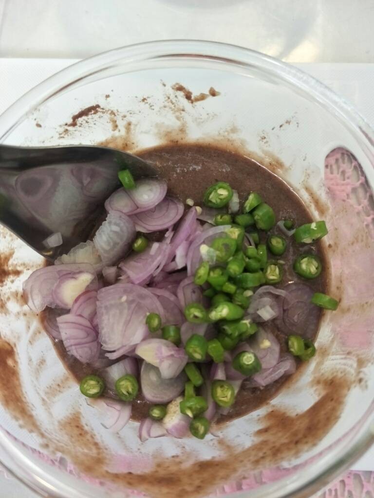 1. นำน้ำปลาหวานที่เหลือจากการเคี่ยวมาใส่ชามผสมเอาไว้ ซอยพริกขี้หนูและหอมแดงเช่นเดิม