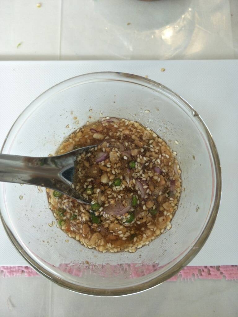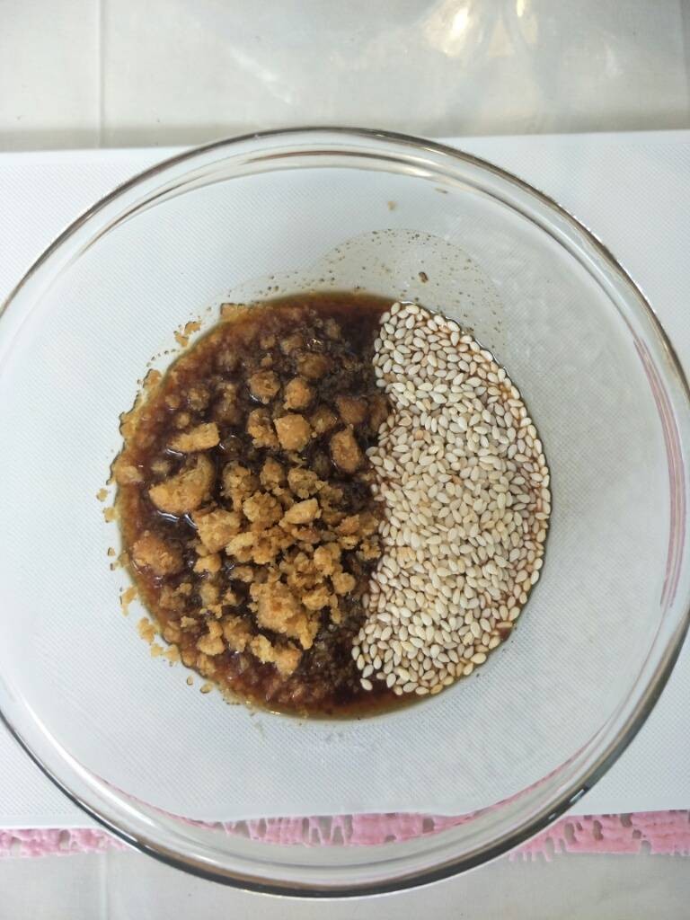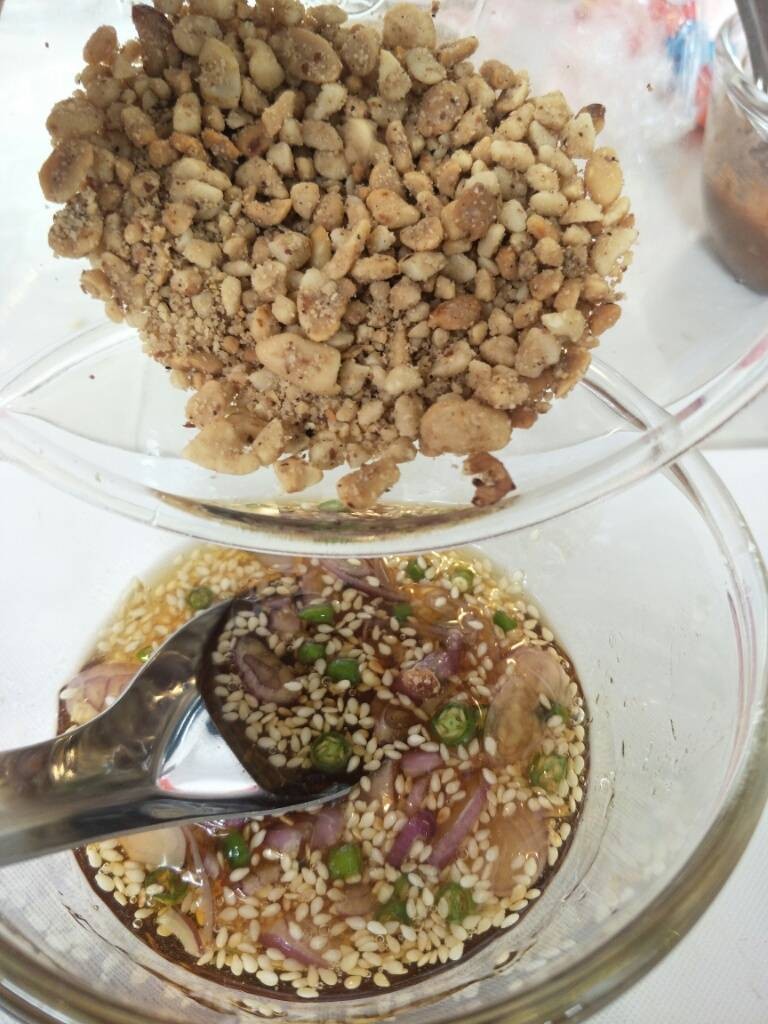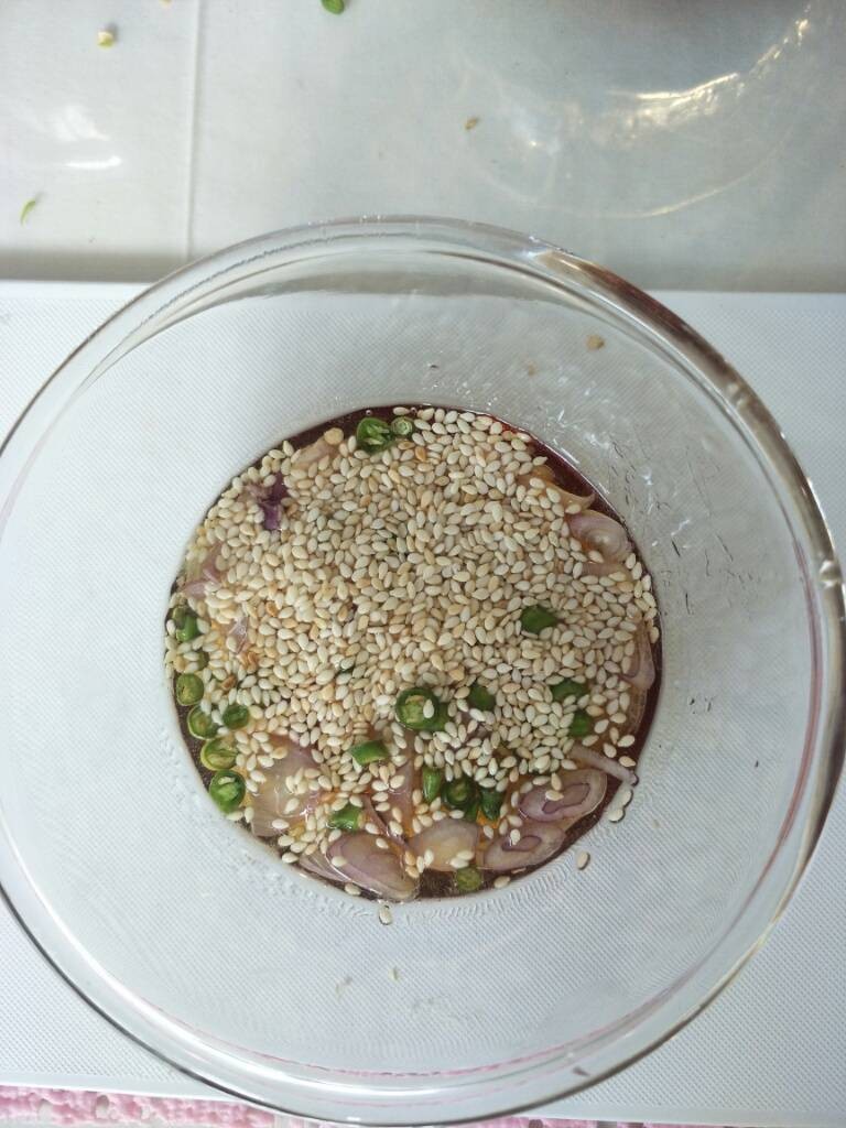 2. ใส่พริกขี้หนูซอย หอมแดงซอยและงาที่ทำการคั่วไฟอ่อนๆ แล้ว ลงไปในชามส่วนผสม