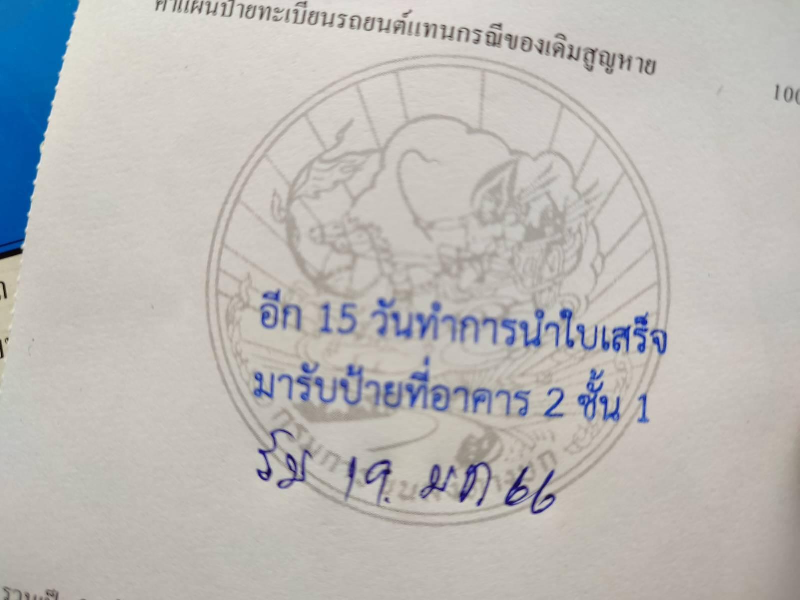 เนื่องจากรถยนต์คันสำรองไม่ค่อยได้ใช้ และป้ายหายตอนน้ำท่วม 1ป้าย เลยต้องไปขอที่กรมขนส่ง(ที่จดทะเบียน)คือ จตุจักร (ขนส่งพื้นที่เขต 5)