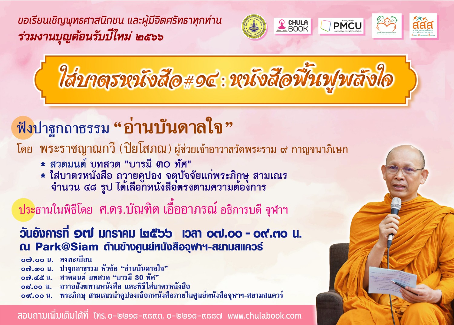 ในวาระศุภมิ่งมงคลขึ้นปีใหม่ 2566 ศูนย์หนังสือจุฬาลงกรณ์มหาวิทยาลัย ร่วมกับ วัดพระราม ๙ กาญจนาภิเษก สำนักงานจัดการทรัพย์สินจุฬาลงกรณ์มหาวิทยาลัย และแผนงานสร้างเสริมวัฒนธรรมการอ่าน (สสส.) ขอเชิญร่วมกิจกรรม “ใส่บาตรหนังสือ ครั้งที่ 14 : หนังสือฟื้นฟูพลังใจ” โดยเปิดโอกาสให้ประชาชนชาวไทยได้ร่วมกันทำบุญใส่บาตรหนังสือให้กับพระสงฆ์และสามเณร จำนวน 48 รูป ซึ่งกำลังศึกษาอยู่ในโรงเรียนพระปริยัติธรรม