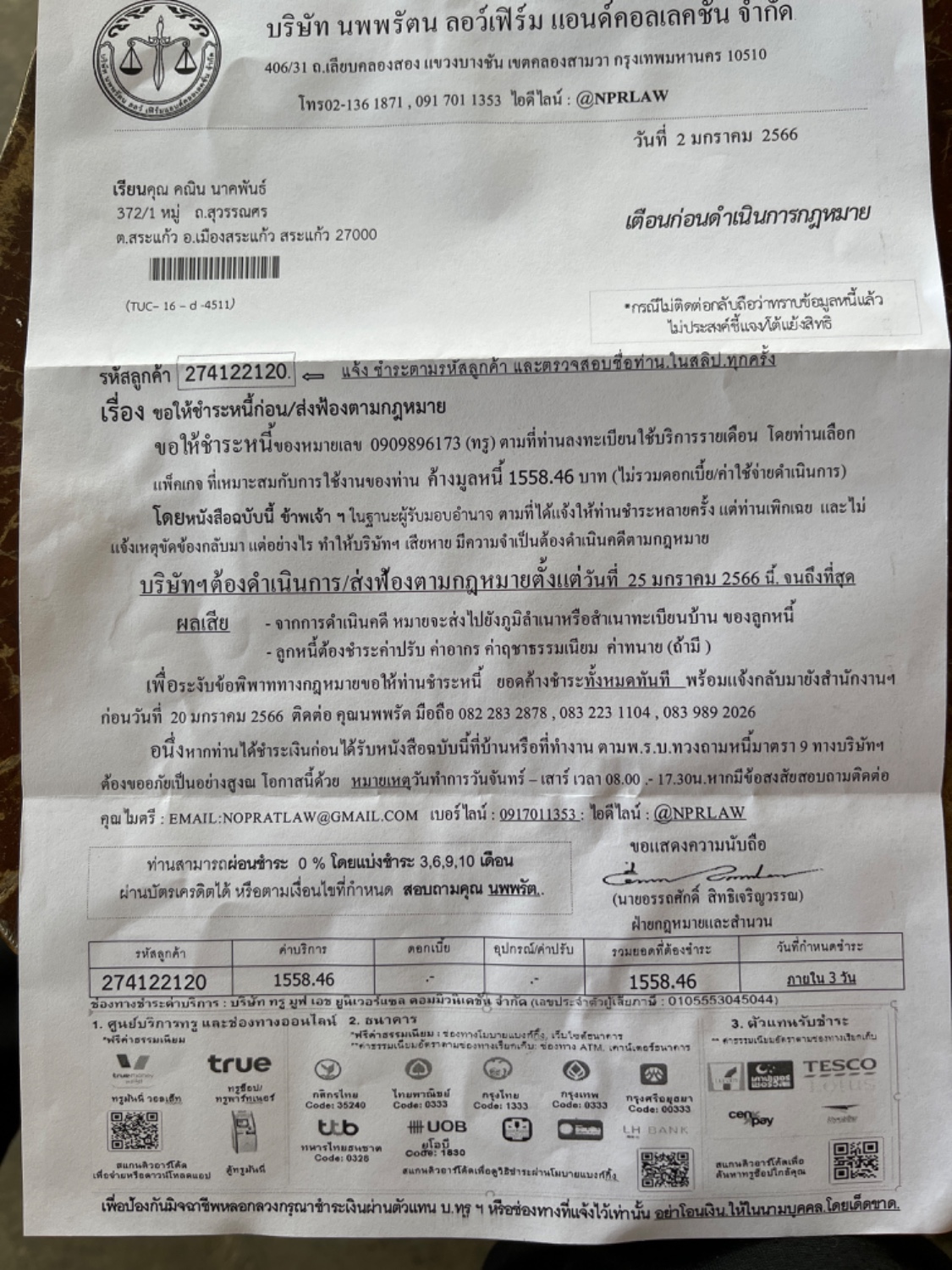 มีหนังสือขอให้ชำระหนี้จากบริษัท ทรัพย์เพิ่มพูล กฎหมายและการบัญชี จำกัด ส่งมาที่บ้าน ซึ่งหากไม่ชำระจะโดนดำเนินคดีตามกฎหมายตั้งแต่วันที่ 6 ธันวาคม 2566 ซึ่งเราไม่รู้ว่าค่าใช้จ่ายและยอดที่ต้องชำระคือค้าง