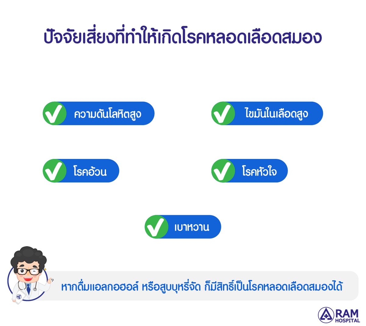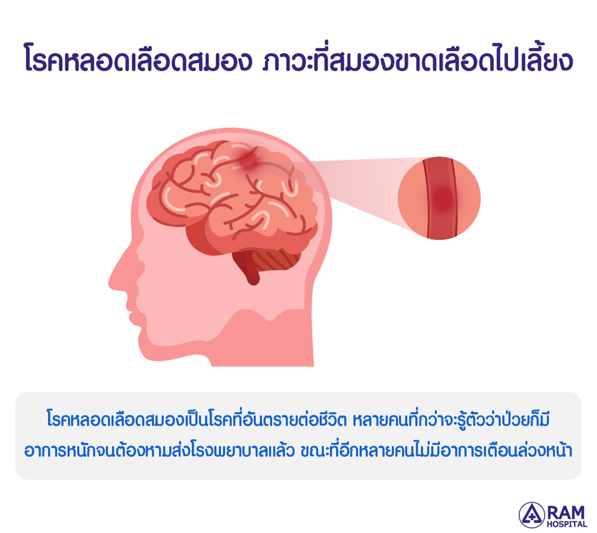 แม้บางครั้งอาการเหล่านี้เมื่อเป็นแล้วอาจดีขึ้นได้เอง ก็อย่านิ่งนอนใจให้รีบไปพบแพทย์ตรวจวินิจฉัยและรับการรักษาที่เหมาะสม เพราะเมื่อสมองขาดเลือดหรือมีเลือดออกในสมอง เซลล์สมองจะเริ่มตายลงเรื่อยๆ จำเป็นต้องได้รับการรักษาอย่างเร็วที่สุด เพราะยิ่งรักษาเร็ว ก็จะยิ่งได้ผลดีช่วยให้ผู้ป่วยฟื้นตัวเป็นปกติหรือใกล้เคียงปกติ ลดโอกาสการเสียชีวิตและความพิการที่อาจเกิดขึ้นได้ อ่านข้อมูลเพิ่มเติมคลิก >> https://www.ram-hosp.co.th/news_detail/222
