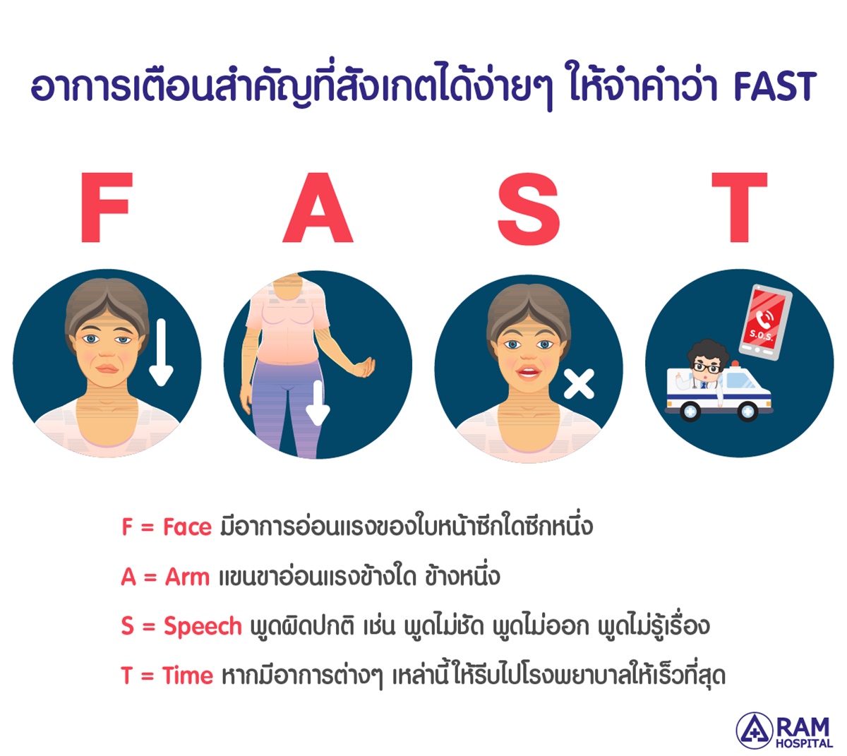 อาการเตือนสำคัญ ที่สังเกตได้ง่ายๆ ให้จำคำว่า FAST ที่แสดงถึงอาการของโรคหลอดเลือดสมองที่เกิดขึ้นอย่างฉับพลัน