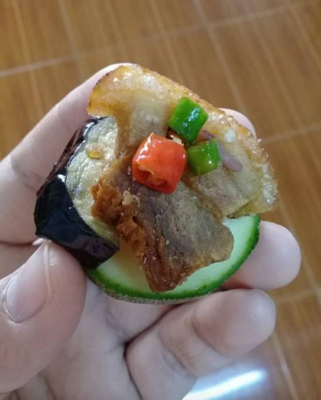 2. มะเขือม่วง ไปนาบกระทะ หั่นชิ้นเล็ก ๆ