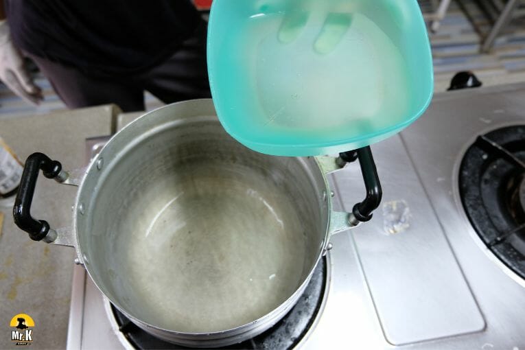 2.) จากนั้นก็ตั้งหม้อเปิดไฟ แล้วเทน้ำเปล่า 600 มิลลิลิตรลงไปต้มให้เดือด