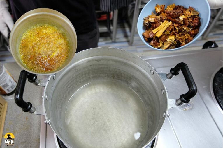 3.) แล้วใส่เม็ดเก๊กฮวยที่ทุบละเอียดแล้วลงไปต้ม ต้มให้ได้สีเหลืองเข้มของน้ำเก๊กฮวยเลยนะครับ