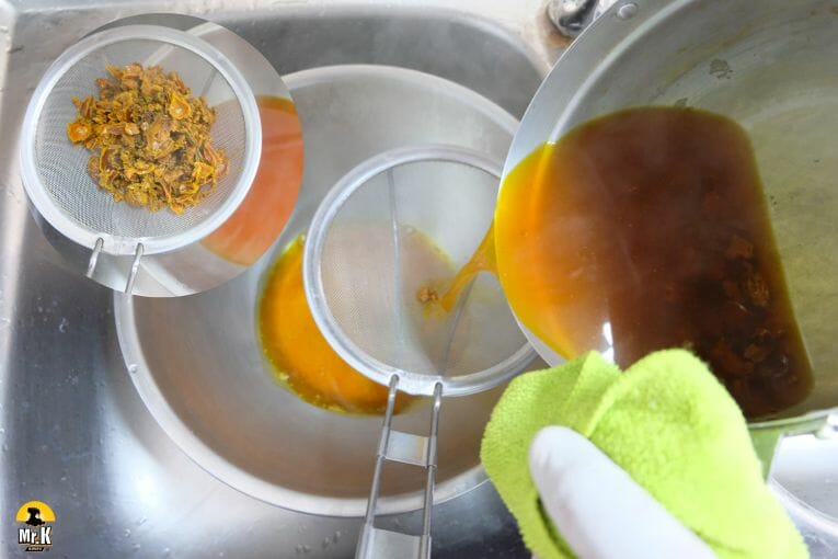 4.) เมื่อเสร็จแล้วก็ปิดแก๊ส แล้วนำน้ำที่ต้มเม็ดเก๊กฮวยของเราไปกรองเศษออกให้หมด