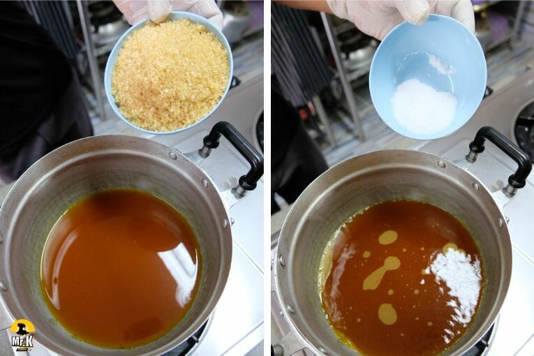 6.) ใส่น้ำตาลทรายแดงลงไป 500 กรัม ตามด้วยเกลือลงไป 30 กรัม