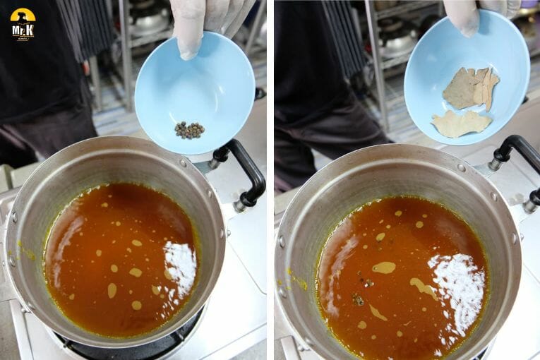 7.) เม็ดพริกไทยดำประมาณ 20 เม็ด ต่อด้วยใบกระวาน 1-2 ใบ แล้วคนไปเรื่อยๆจนกว่าน้ำตาลทรายแดงจะละลาย