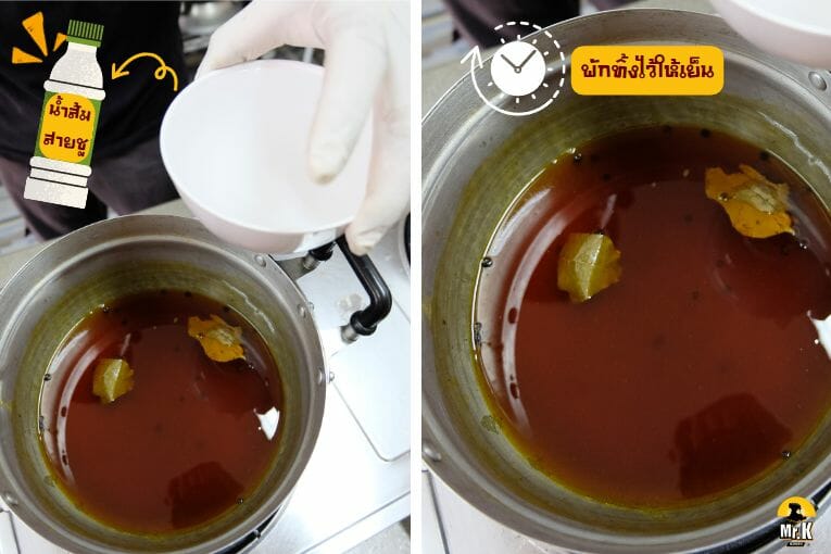 9.) จากนั้นก็ใส่น้ำส้มสายชูลงไป 300 มิลลิลิตร คนส่วนผสมทั้งหมดให้เข้ากัน แล้วพักทิ้งไว้ให้เย็นตัวครับ