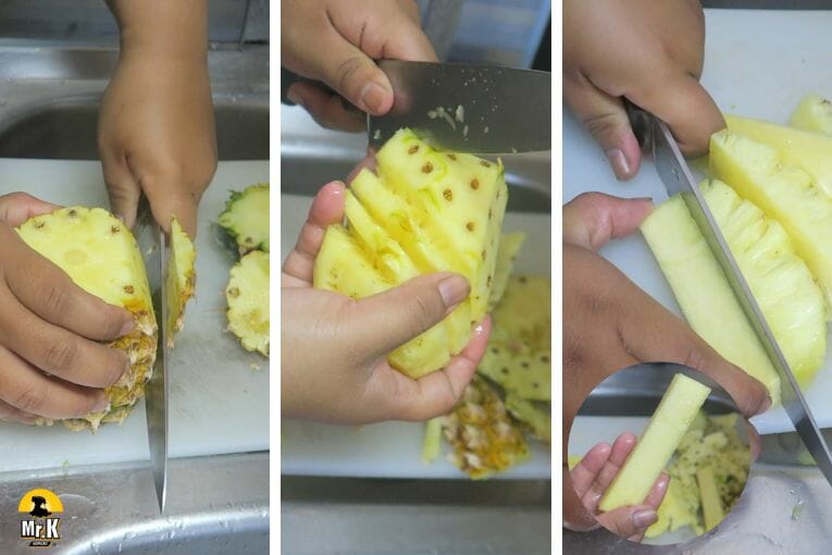 1.) นำสับปะรดมาปอกเปลือก เอาตาสับปะรด และแกนกลางออกครับ