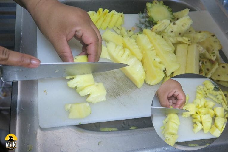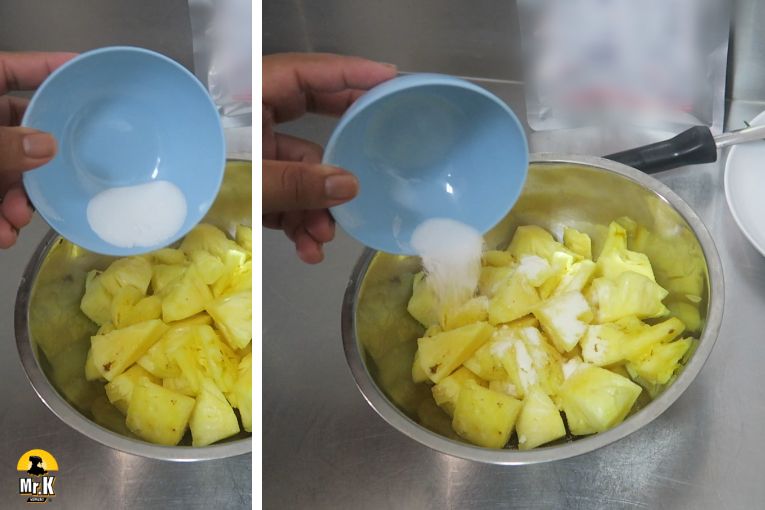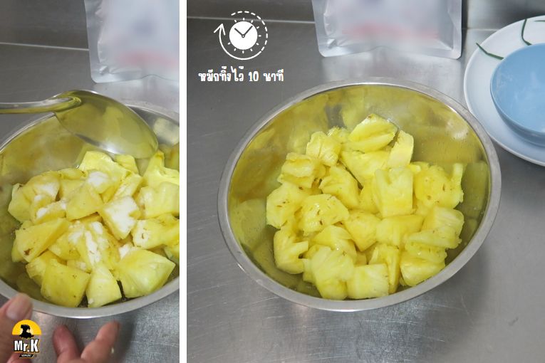 3.) นำสับปะรดที่หั่นเรียบร้อยแล้ว มาหมักด้วยเกลือ 8 กรัม