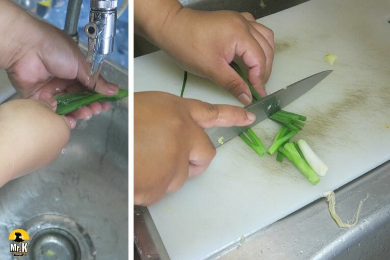 5.) ระหว่างที่รอก็มาล้างต้นหอม 1 ต้น ล้างให้สะอาด แล้วหั่นเป็นท่อนๆ ประมาณ 1 นิ้ว