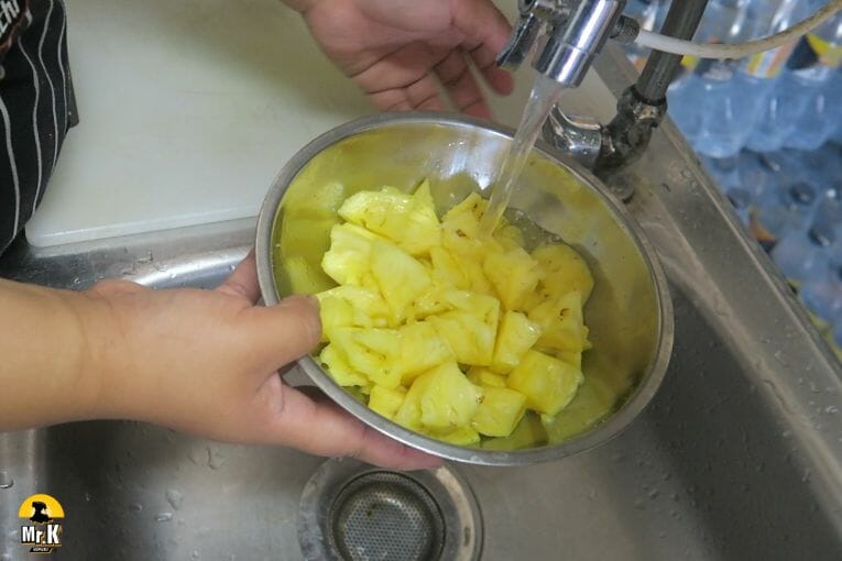 6.) หลังจากนั้นนำสับปะรดที่หมักเกลือครบ 10 นาทีแล้วมาล้างน้ำออก 2-3 รอบ