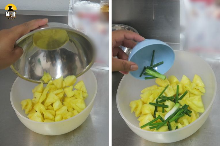 7.) ต่อด้วยนำสับปะรด ต้นหอม ที่เตรียมไว้เทใส่ชาม